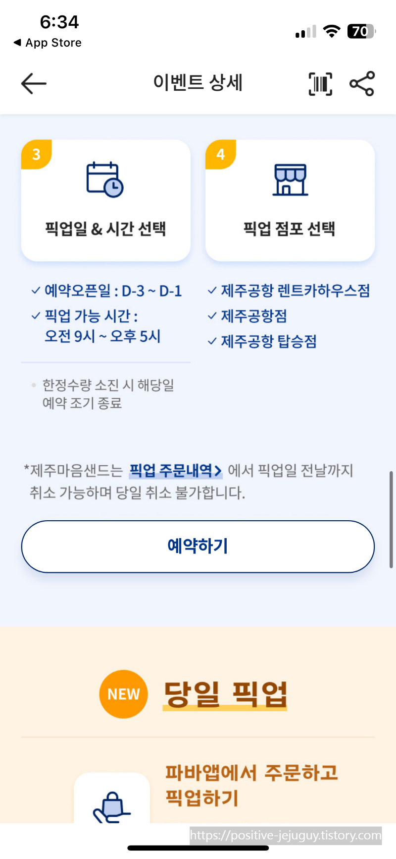 제주마음샌드 예약은 픽업 3일 전부터 하루 전까지 가능하고, 픽업 시간은 당일 오전 9시~오후 5시까지이다.