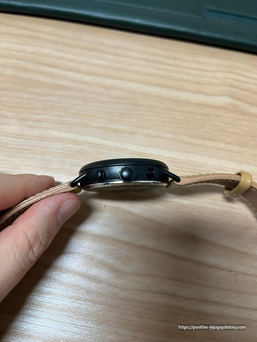 크로노그래프가 있어 뭔가 포스가 느껴지는 디자인에 검은색 문자판 거기다 브라운 가죽 밴드의 조합은 눈에 확 띄었다.