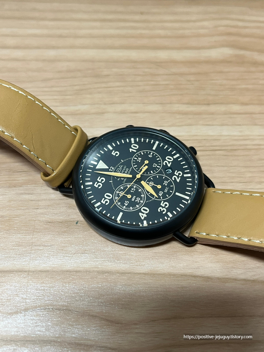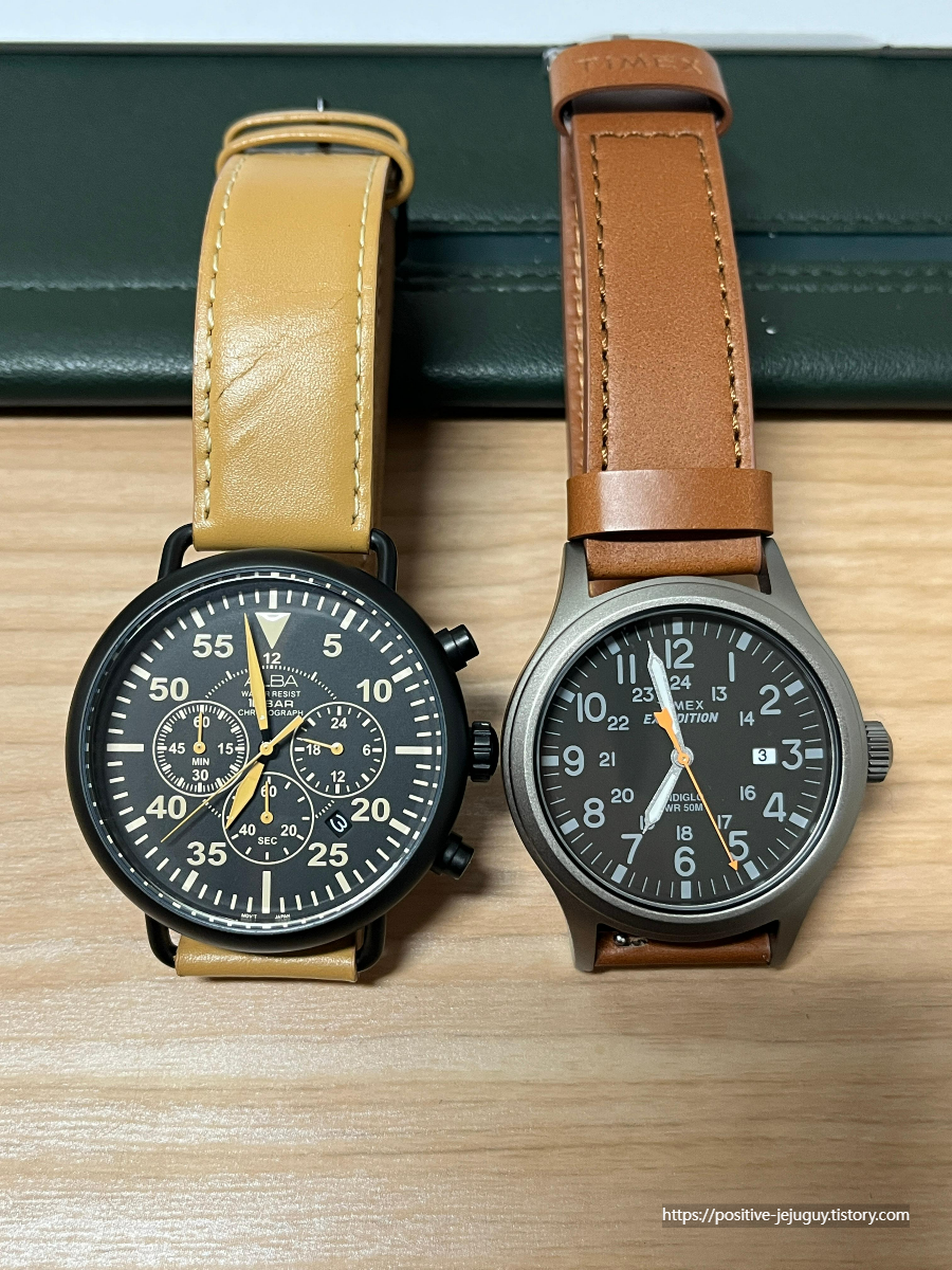 검은색 문자판과 갈색 가죽 스트랩의 공통점이 있어 타이맥스 익스페디션을 배송 받았을 때 알바 빅파일럿 크로노가 생각이 났다.